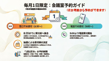 - 2026-02-03 【施設利用】令和8年4月分・5月分の受付は3月1日㈰から開始... 令和8年4月分・5月分のアリーナ団体予約・会議室予約の受付は3月1日㈰から開始します。 なお、施設利用をお考えの方は、空き情報(利用状況)をご確認の上、 ご予約をお願いいたします。